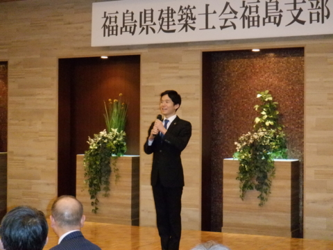 建築士事務所協会県北支部長の河野忠様からもご挨拶を頂戴し、ふくしま建築住宅センター県北事務所の荒 裕二次長の御発声により乾杯。参加者の皆さんは、講習会で勉強したことを確認しあったり、今年の目標を語らったりと、それぞれに和やかで楽しいひと時を過ごしました。